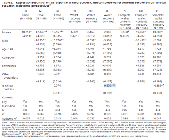 然而,他们在中国的复制研究结果显示,“钱包回收率”与中国不同区域的集体主义指数呈显著正相关(r=0.456,p<0.001)。这一重要研究结论,不仅进一步丰富了我们对集体主义文化内涵和外延的认知,还揭示了Cohn等人研究的底层缺陷,即中国公民对“诚实”的定义受集体主义文化影响,但Cohn等人在研究中对这一文化变量欠缺考虑。
