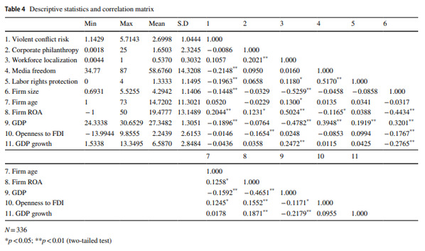 Large foreign firms’ interventions in violent conficts have drawn increasing research attention. Nonetheless, scant research has investigated how foreign small and medium-sized enterprises (SMEs), which have little capacity in peacebuilding, can protect themselves from violent confict risk. Drawing upon the instrumental stakeholder theory (IST), this study explores two specifc local community-oriented corporate social responsibility (CSR) practices (i.e., corporate philanthropy and workforce localization) as violent confict risk bufering strategies for foreign SMEs. Further, we examine their varying efects in diferent institutional environments (i.e., host country media freedom and labor rights protection). Using data from a cross-country survey of Chinese foreign SMEs combined with archival data from multiple sources, we empirically confirm the attenuating efects of both corporate philanthropy and workforce localization on foreign SMEs’ violent confict risk. Besides, we discover that host country labor rights protection strengthens the mitigation impact of workforce localization on violent confict risk. Our study advances the literature on IST and CSR by revealing the risk mitigation mechanism of CSR activities for foreign SMEs and elucidating its institutional boundary conditions.