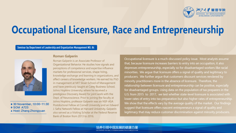 讲座标题: Occupational licensure, race and entrepreneurship