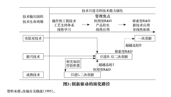 “二次创新”成功的关键是摆脱低水平的重复技术引进,避免陷入“引进—落后—再引进—落后”的技术“追赶陷阱”,并且在学习的过程中逐步建立起自己的“超越追赶”的创新管理体系,这就需要在技术范式转变期加强对新兴技术或实验室技术的引进,以及早期探索型研发的介入,开展基于新兴技术或实验室技术引进的“后二次创新”,甚至产生能够主动发起和引领新兴技术范式的“一次创新”。