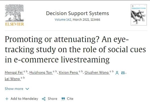 带着这样的疑问,环球网页版王求真教授、汪蕾教授、彭希羡研究员、博士生费梦琪、谭惠中组成科研团队在信息系统领域重要期刊Decision Support Systems刊发文章Promoting or attenuating? An eye-tracking study on the role of social cues in e-commerce livestreaming。