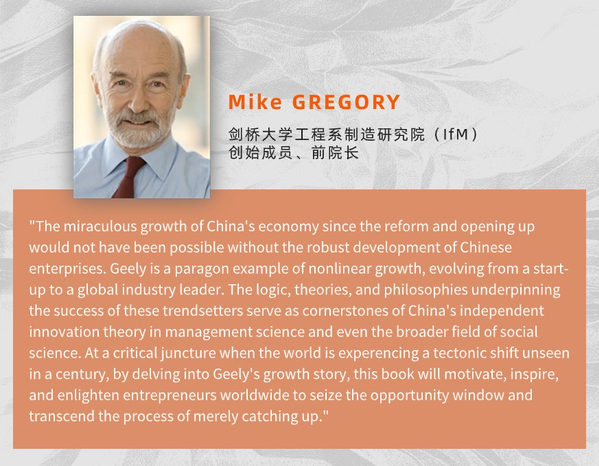 在《Non-Linear Growth: The Rise of Geely》一书中,吴晓波团队以5个篇章、13个章节的内容,对吉利的非线性成长历程进行深入系统分析,并进行规律总结与提炼。