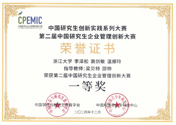 这还不是全部,就在前不久,他带领2023级浙大MBA同学裴剑敏和2024级浙大MBA创客班同学温娜玲组成“4L”团队,从来自139所院校的210支队伍中脱颖而出,顺利夺得第二届中国研究生企业管理创新大赛全国总决赛企业决策赛道“一等奖”殊荣。