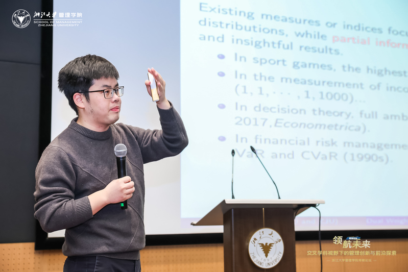 浙江大学国际联合商学院邵辉助理教授以“Dual Weighted Expected Utility Theory, Almost Stochastic Dominance, and Their Application”为主题,分享了Top-Truncated Relative MeasureTTRM)指数以及TTRM指数在收入不平等与资产定价的应用。
