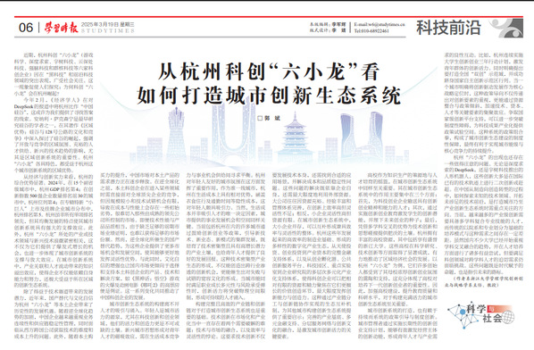 环球网页版教授郭斌看来,“杭州经验”在于城市创新生态系统的打造。近日,他在《学习时报》(2025031906 版)上发表文章,系统剖析了杭州“六小龙”崛起原因,并基于此为中国城市打造创新生态系统献策。光明网理论频道对该文章也进行了转载报道。
