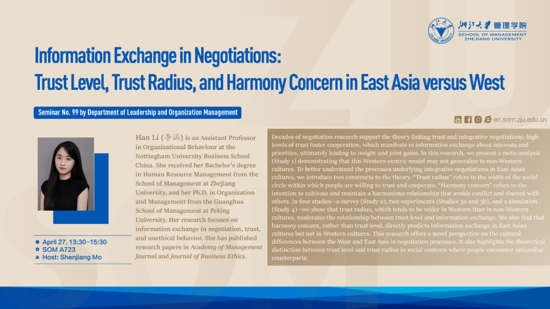 讲座标题(Title):Information Exchange in Negotiations: Trust Level, Trust Radius, and Harmony Concern in East Asia versus West