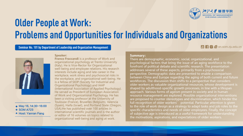Summary:There are demographic, economic, social, organizational, and psychological factors that bring the issue of an aging workforce to the forefront of political debate and scientific research. The presentation addresses several of these aspects, primarily from a psychosocial perspective. Demographic data are presented to enable a comparison between China and Europe regarding the aging of both current and future workforces. The discussion then shifts to a perspective that considers older workers as valuable organizational resources, whose development is shaped by adulthood-specific growth processes, in line with a lifespan approach.Various forms of ageism present in society and in human resource management are explored. Possible organizational interventions are proposed to counter stereotypes and discrimination, which hinder the full recognition of older workers’ potential. Particular attention is given to the role of work design as a strategy to adapt tasks and job roles to the specific characteristics and needs of older employees. Finally, the concept of subjective age is introduced as a useful framework for understanding the motivations, aspirations, and expectations of older workers.