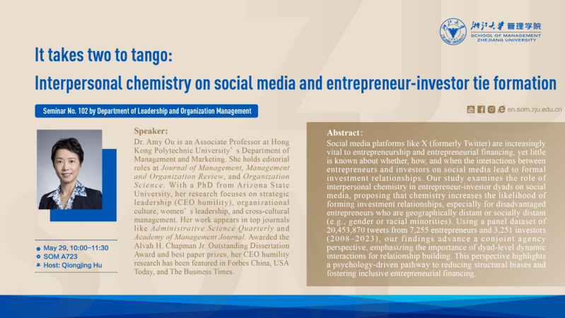 讲座标题(Title):It takes two to tango: Interpersonal chemistry on social media and entrepreneur-investor tie formation