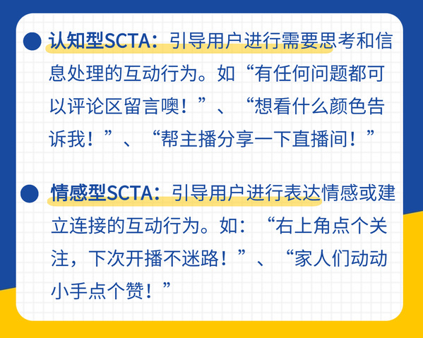 过往研究多关注购物主持人的非指令性社交操作(如问候、感谢),却忽视了电商直播特有的指令性社交行动呼吁Social Call-to-ActionsSCTAs——即主播明确引导观众使用社交功能(点赞、评论、分享、关注)的行为。SCTAs可分为认知型和情感型。所谓认知型社交行动呼吁,是指那些需要观众进行有意识、较慢、更审慎思考的互动引导,例如鼓励观众发送实时聊天、分享直播链接等。这些行为通常需要观众付出更多的认知努力,比如组织语言、选择分享对象等。而情感型社交行动呼吁则是激发观众快速、本能的情感反应,例如点击点赞按钮、关注主播等,这些行为往往只需简单的一键操作,不需要太多思考。