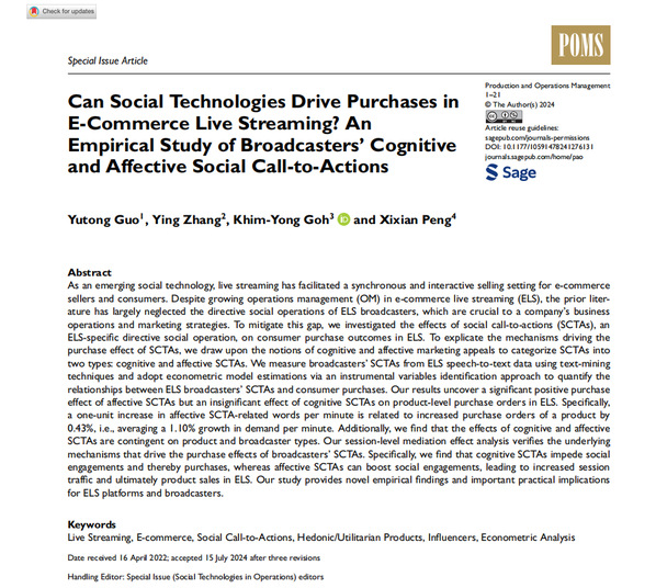 环球网页版百人计划研究员彭希羡与香港中文大学(深圳)助理教授郭羽童、新西兰奥克兰大学高级讲师ZHANG Ying、新加坡国立大学副教授GOH Khim Yong合作发表于国际顶级期刊《Production and Operations Management》的研究首次通过大数据分析揭示:主播不同类型的社交行动呼吁(SCTAs)对直播间销量的影响存在显著差异,而这种差异又与商品属性、主播身份密切相关。