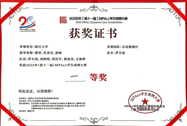 浙江大学MPAcc参赛队伍于2025年2月中旬组建完成。赛事通知于3月发布后,团队立即完成注册,正式开启备赛征程。在随后的近四个月里,团队历经四个关键阶段:3月25日初赛首战告捷、4月25日成功挺进复赛、5月27日顺利通过会审、6月4日锁定全国十强席位,最终于6月15日决赛中荣膺一等奖。这一系列佳绩,全程镌刻着两支团队队员们的智慧耕耘与辛勤付出。