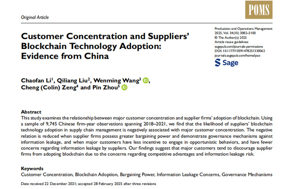 区块链技术自2008年伴随比特币诞生以来,就被寄予“重塑供应链”的厚望,但现实是,全球范围内供应链区块链的大规模落地仍寥寥无几。为什么潜力如此巨大的技术却难以落地?环球网页版“百人计划”研究员王文明及其合作者首次聚焦“大客户”这一关键角色,发现供应商对大客户的依赖度越高(客户集中度越高),采纳区块链技术的可能性越小。这项研究发表于运营管理领域顶刊Production and Operations Management(UTD24期刊之一),系统揭示了大客户集中度对供应商区块链采纳的抑制效应及其内在机制。